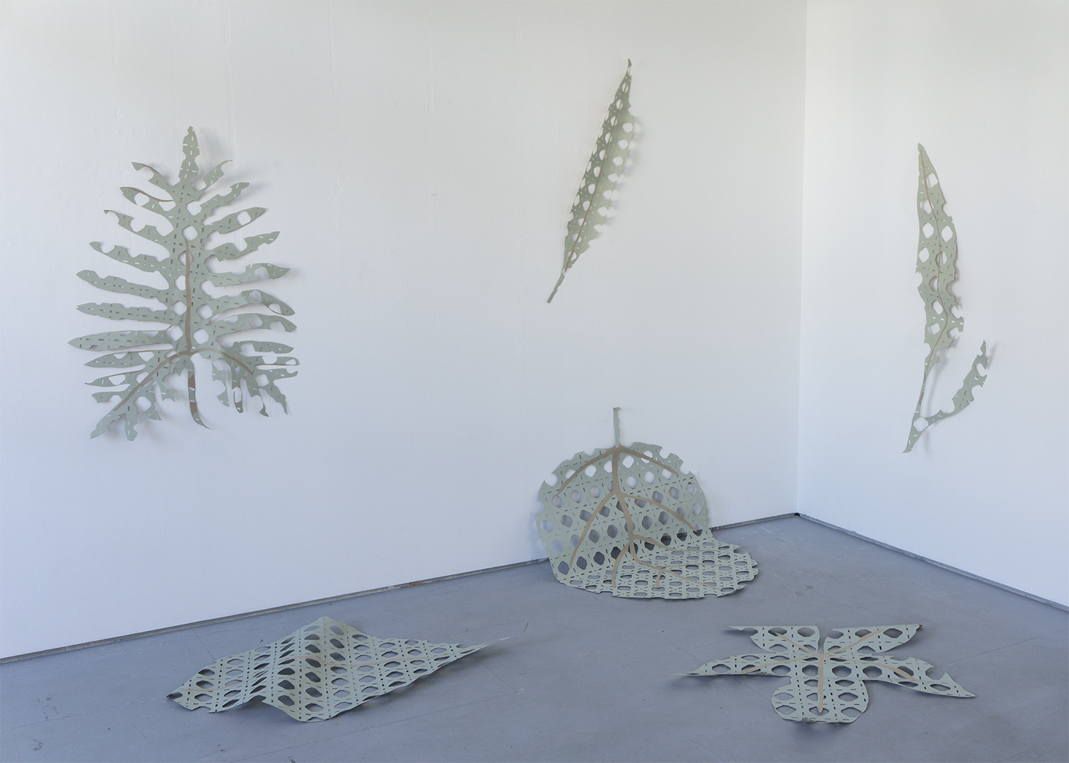 These permeable leave sculptures are crafted in the style of 19th century colonial cane furniture; this style of weaving was praised by Dutch, English and French decorators for its lightness, adaptability and cleanness. The weaving pattern quickly spread from South East Asian colonies to all other European territories in the globe. Their widespread exotic appeal is likened to that of the tropical houseplants that inhabit our homes since colonial times.